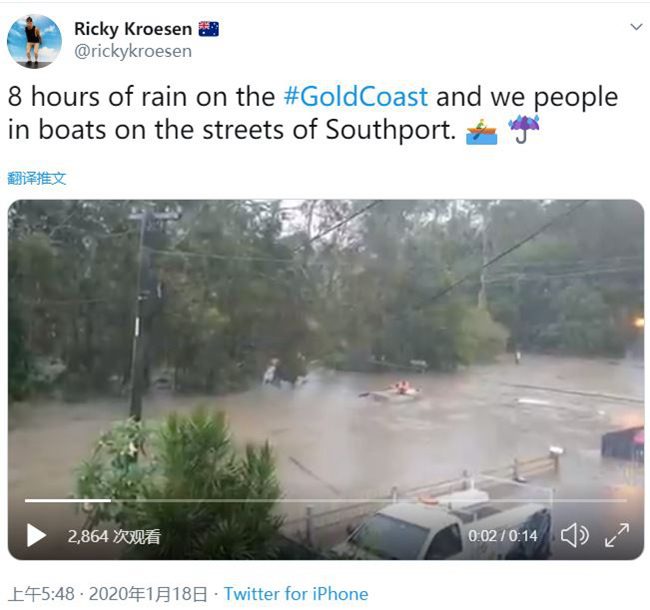 持续多月的山火尚未被扑灭,澳大利亚东部沿海又迎来大暴雨。东部昆士兰州多地突发洪水,导致该州主要道路和旅游景点关闭,部分地区甚至遭遇“百年一遇”降雨。