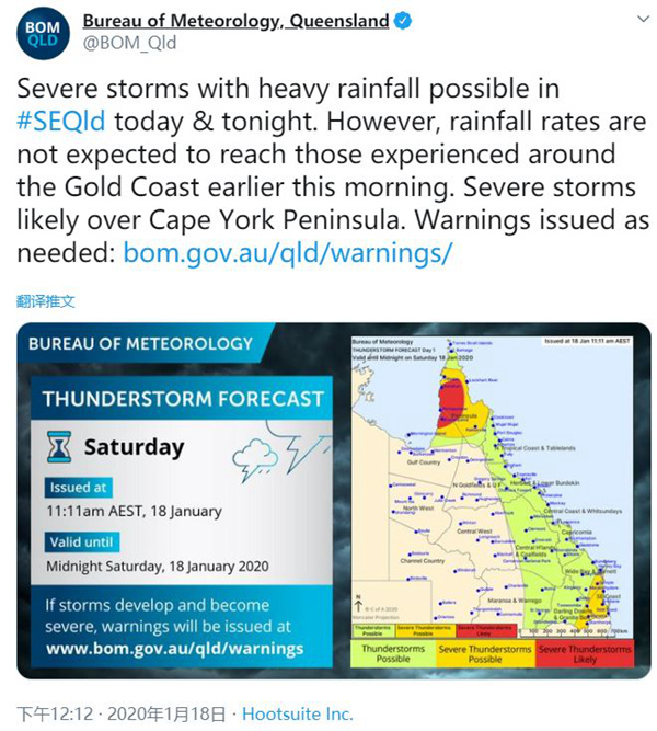 据ABC新闻和路透社1月18日报道,从周五晚到周六早上,昆士兰州遭遇大暴雨,部分地区的降雨量高达330毫米。该州主要高速公路和黄金海岸多个主题公园均被迫关闭。
