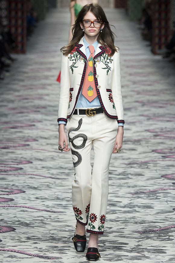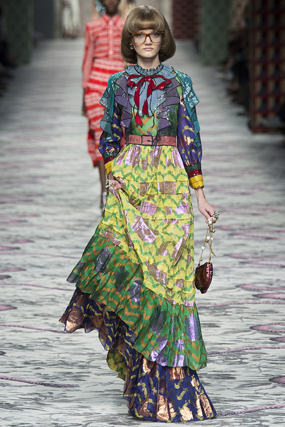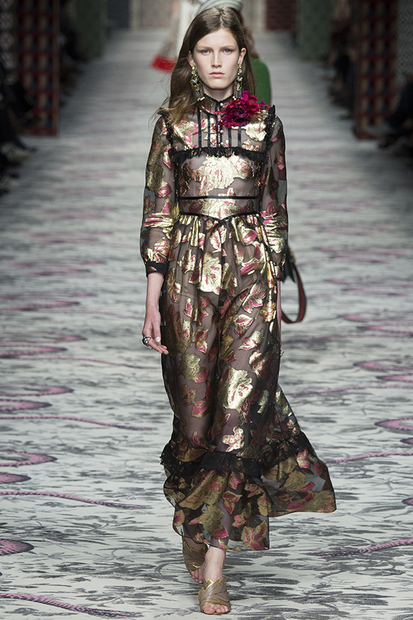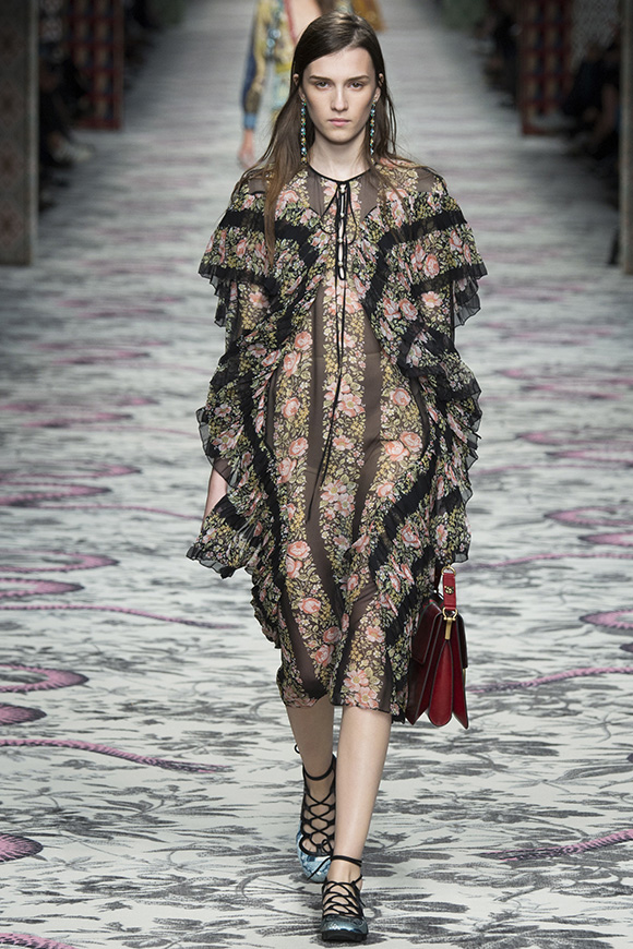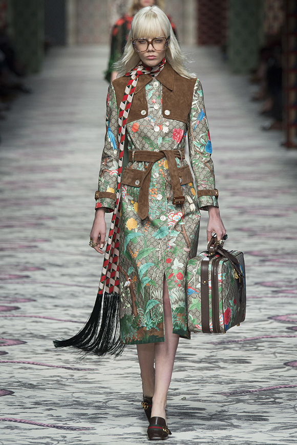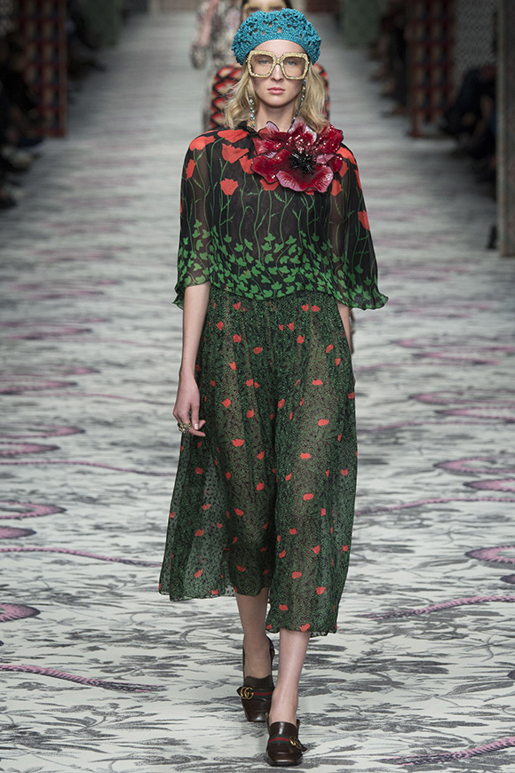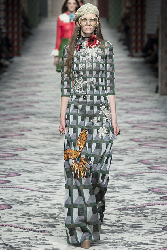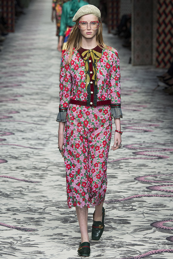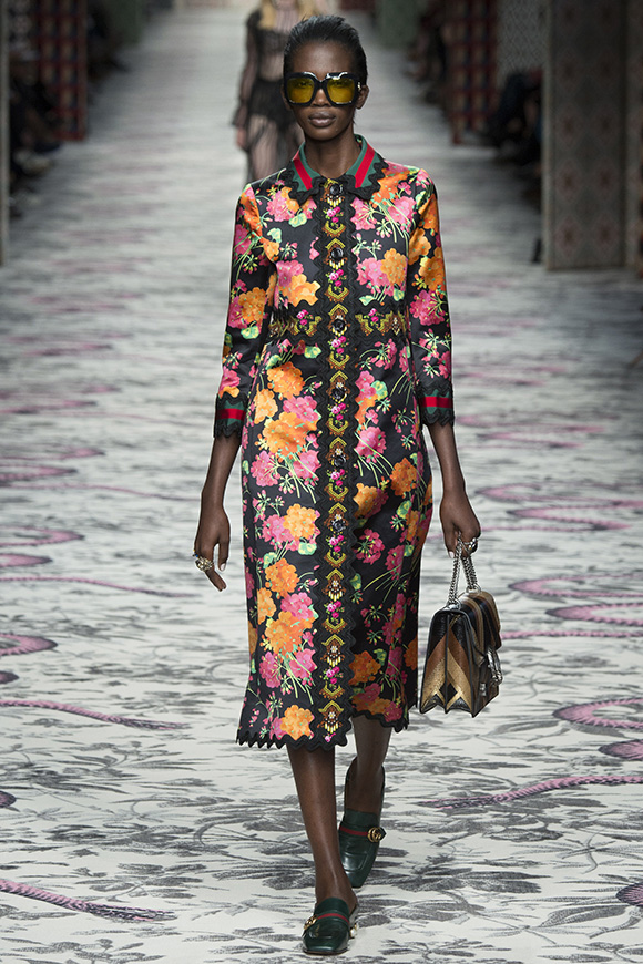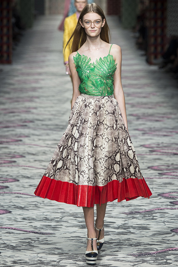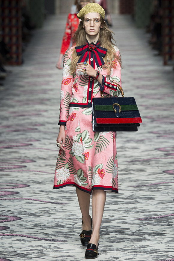 继6月4日发布度假系列后,米兰时装周的2016年春夏发布会是Gucci新任创意总监Alessandro Michele出任以来的第三次成衣秀。在印有蛇形图案的长毯上,从头到脚武装完毕的模特们走完了一场浓烈的复古大秀,整个系列鲜明的风格和色彩被Vogue评价为“非常的意大利”。