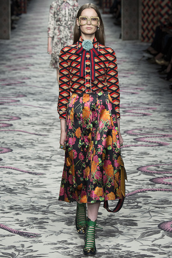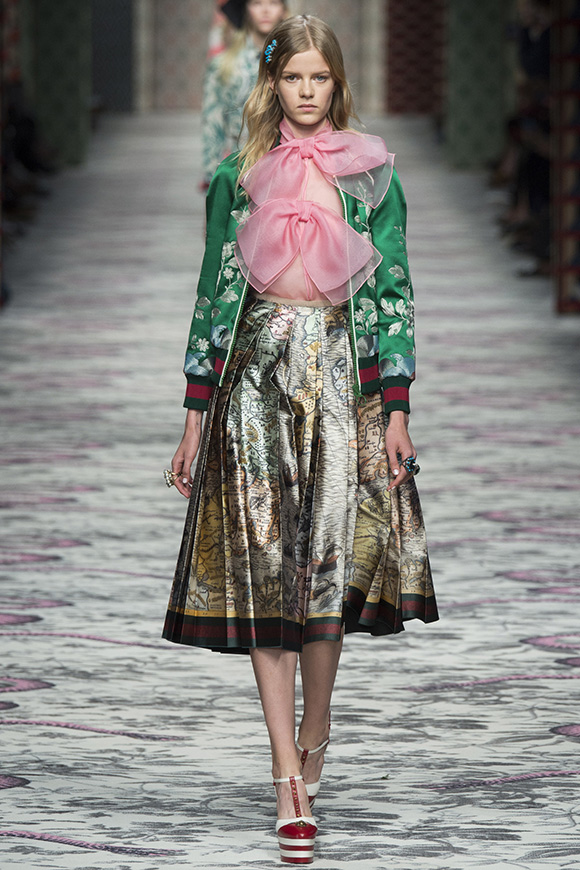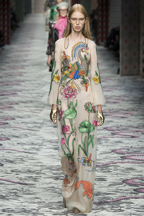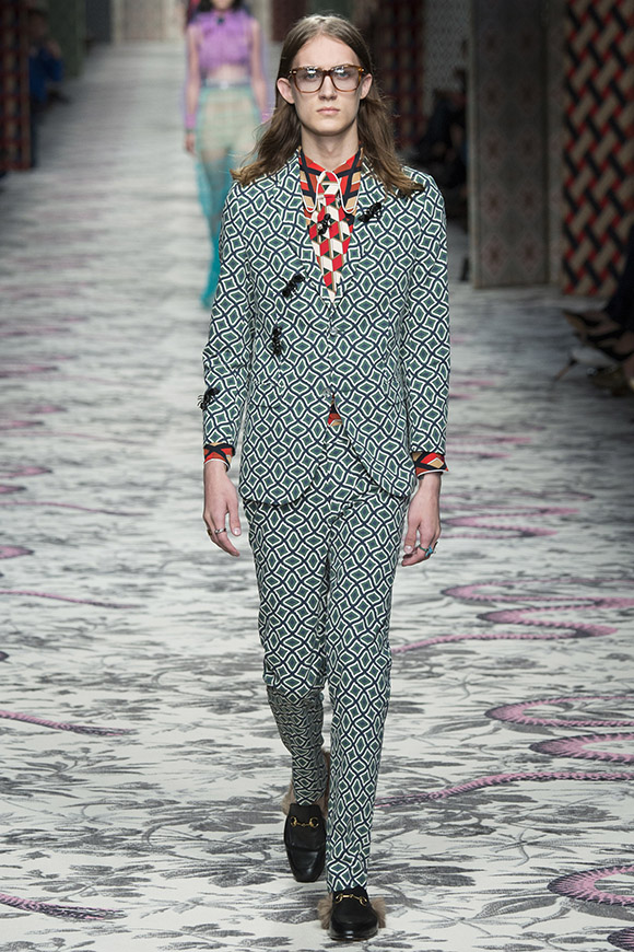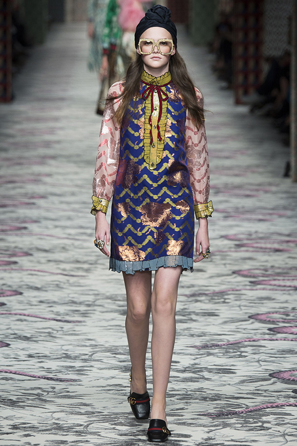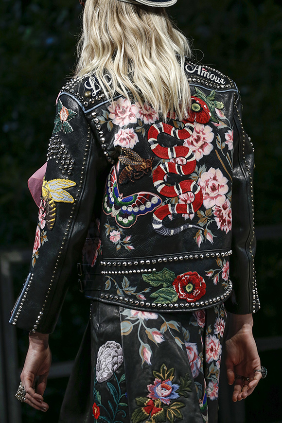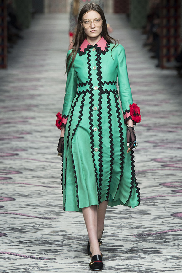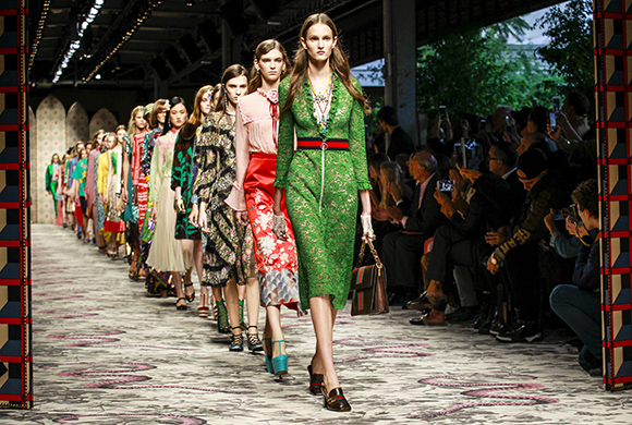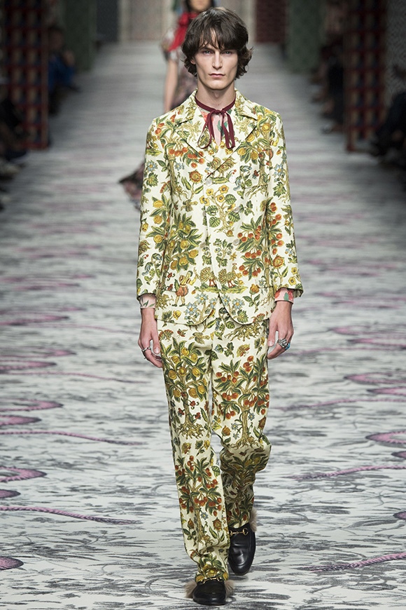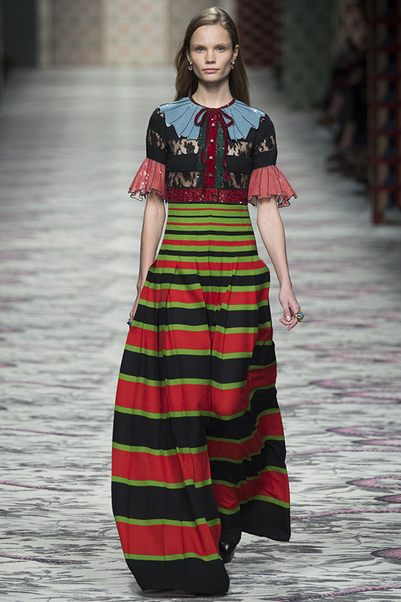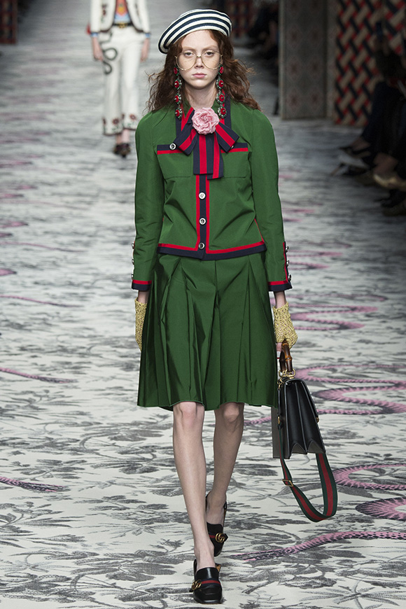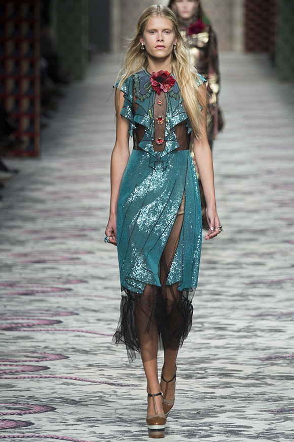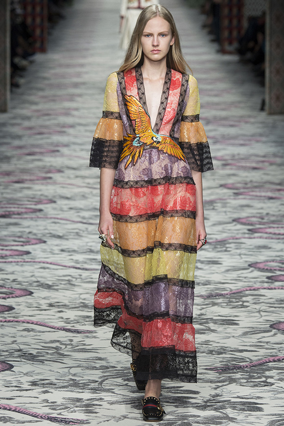 继6月4日发布度假系列后,米兰时装周的2016年春夏发布会是Gucci新任创意总监Alessandro Michele出任以来的第三次成衣秀。在印有蛇形图案的长毯上,从头到脚武装完毕的模特们走完了一场浓烈的复古大秀,整个系列鲜明的风格和色彩被Vogue评价为“非常的意大利”。