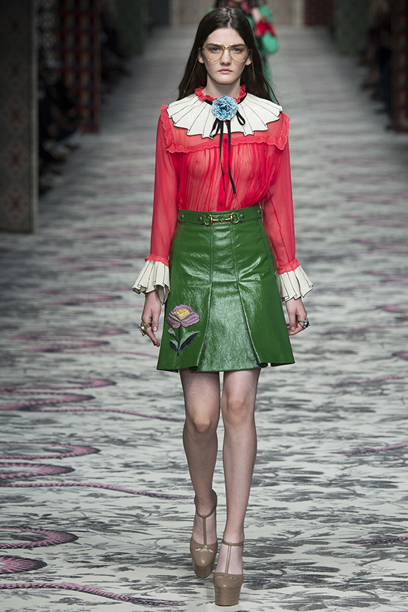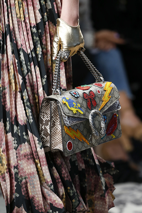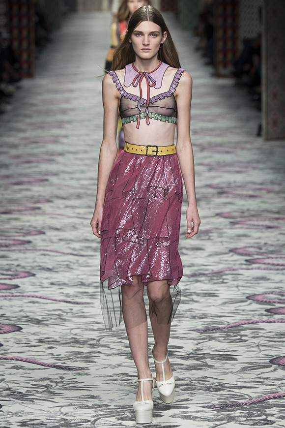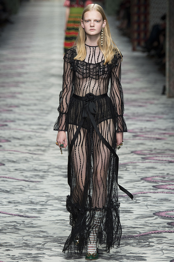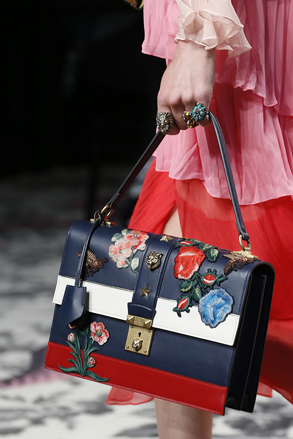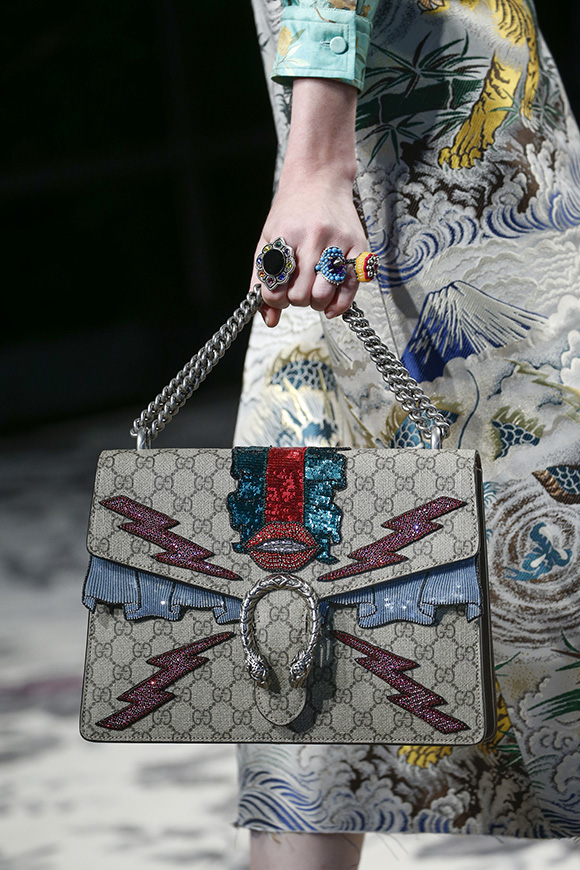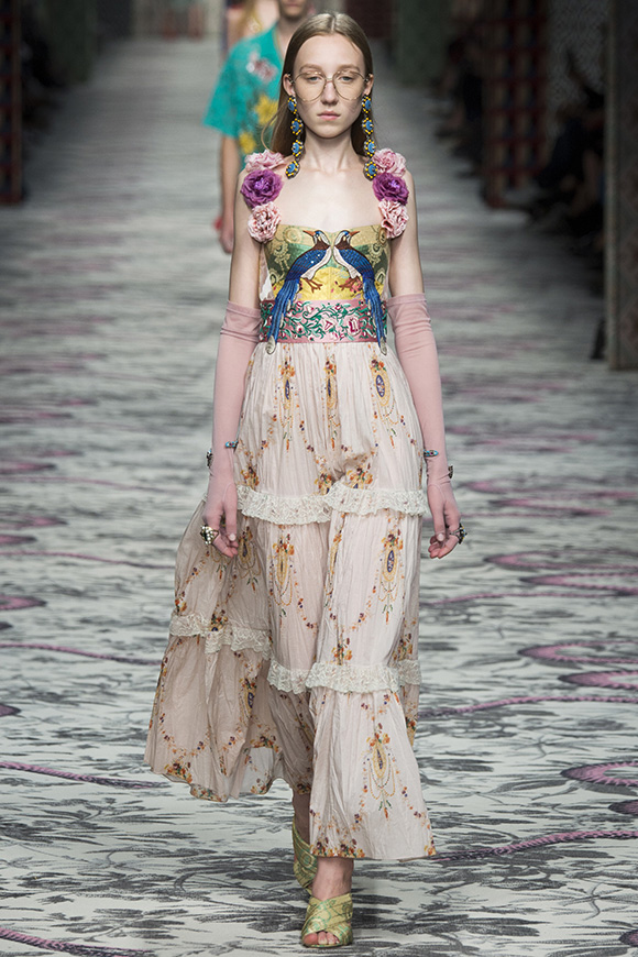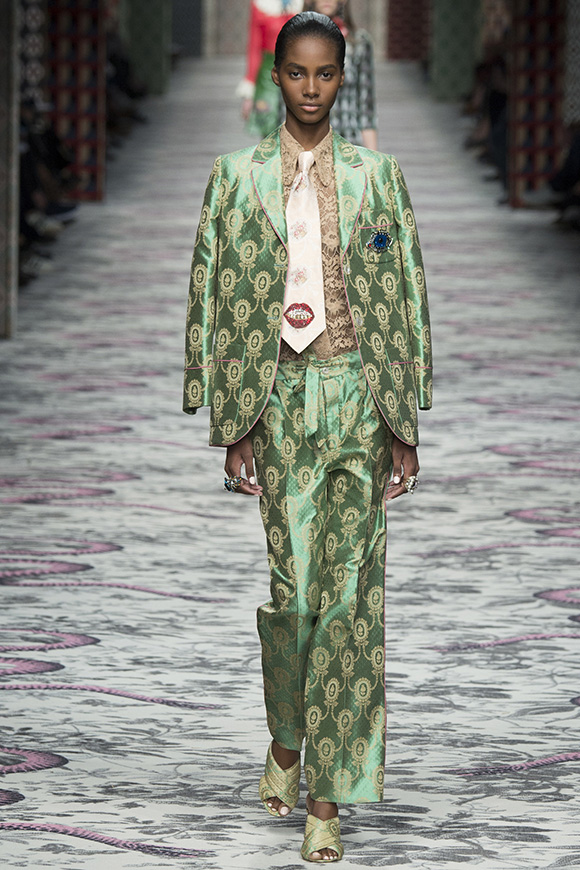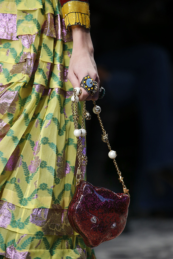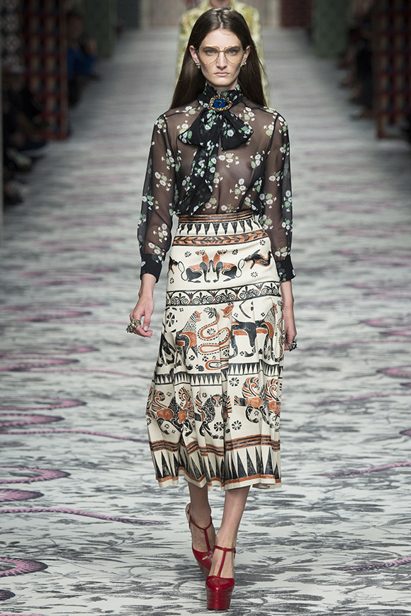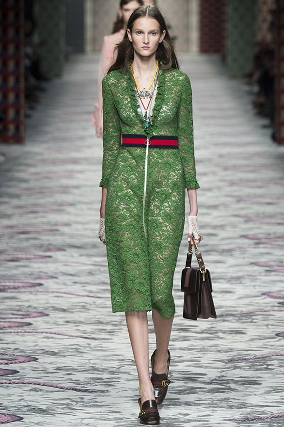 继6月4日发布度假系列后,米兰时装周的2016年春夏发布会是Gucci新任创意总监Alessandro Michele出任以来的第三次成衣秀。在印有蛇形图案的长毯上,从头到脚武装完毕的模特们走完了一场浓烈的复古大秀,整个系列鲜明的风格和色彩被Vogue评价为“非常的意大利”。