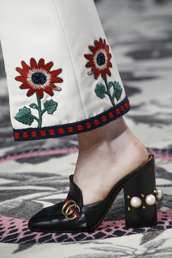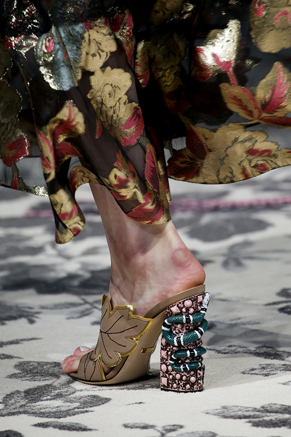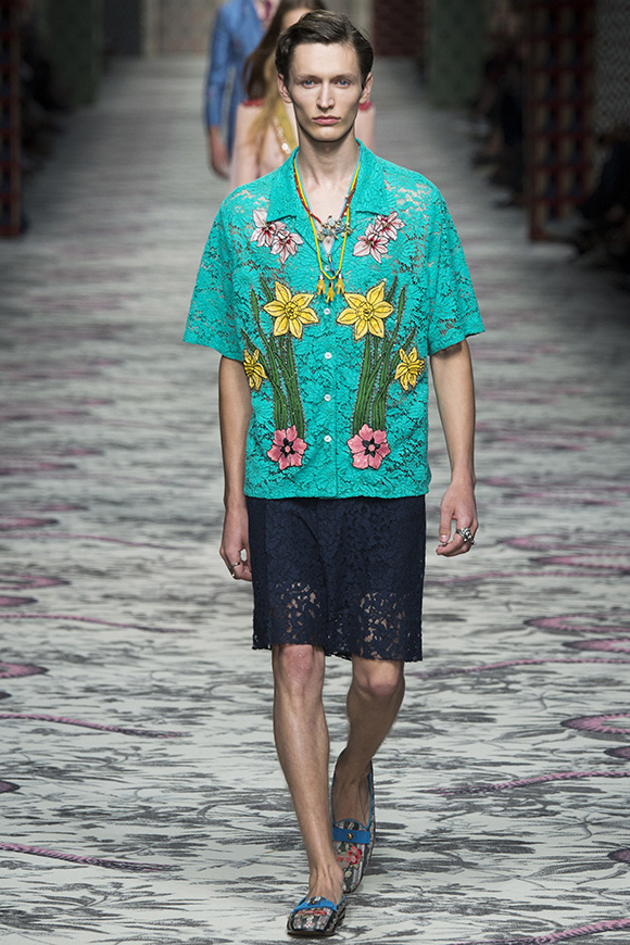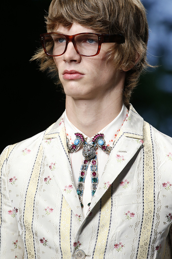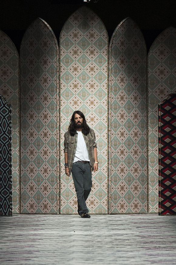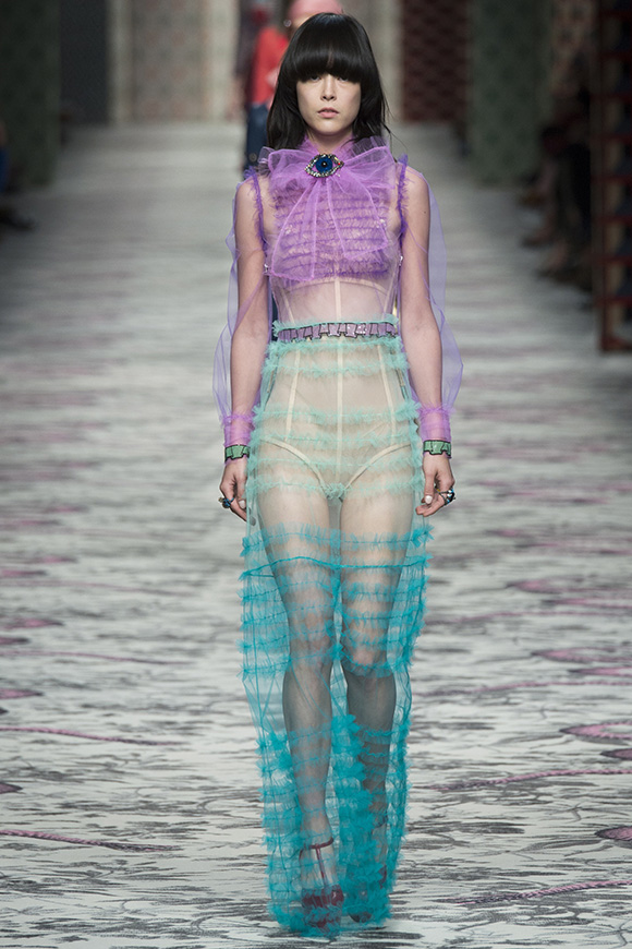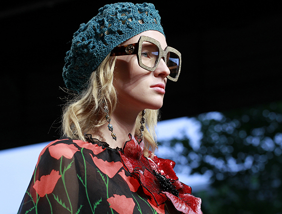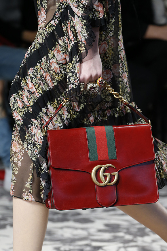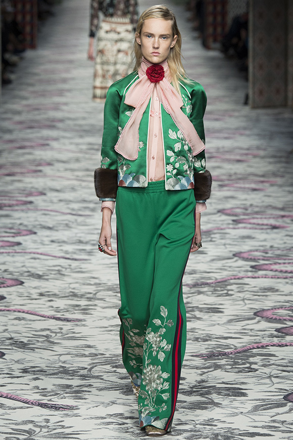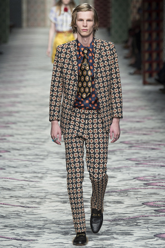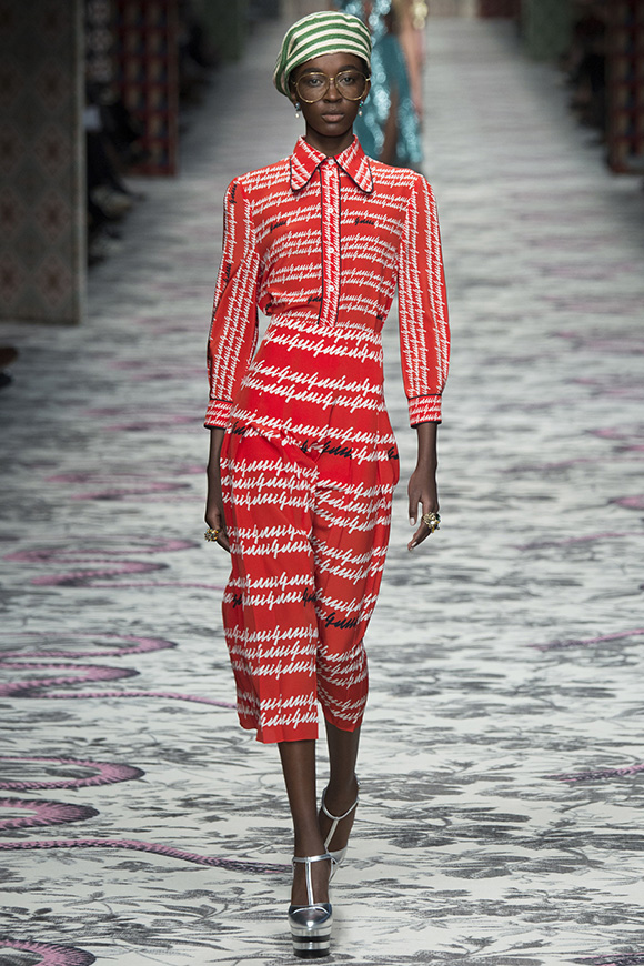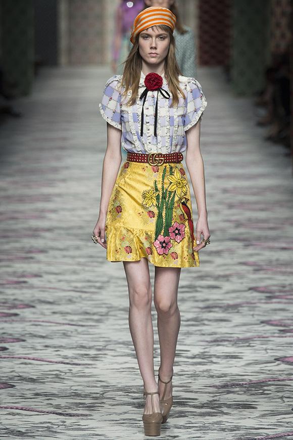 继6月4日发布度假系列后,米兰时装周的2016年春夏发布会是Gucci新任创意总监Alessandro Michele出任以来的第三次成衣秀。在印有蛇形图案的长毯上,从头到脚武装完毕的模特们走完了一场浓烈的复古大秀,整个系列鲜明的风格和色彩被Vogue评价为“非常的意大利”。