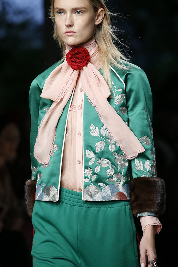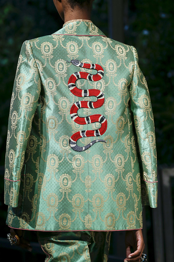 事实上,在这个系列成衣的元素里,我们所看到的蛇形、藤蔓和桠枝等缠绵悱恻、险象丛生的意象均源于这部17世纪的画作。不过有所区别的是,刺绣和钉珠的手工工艺在整个系列里得到了充分发挥,细节度更是饱和到好似高级定制;除了将“绿-红-绿”条纹的标识性跟设计的艺术性结合以外,可以说Michele在个人风格的道路上又迈进了一大步。