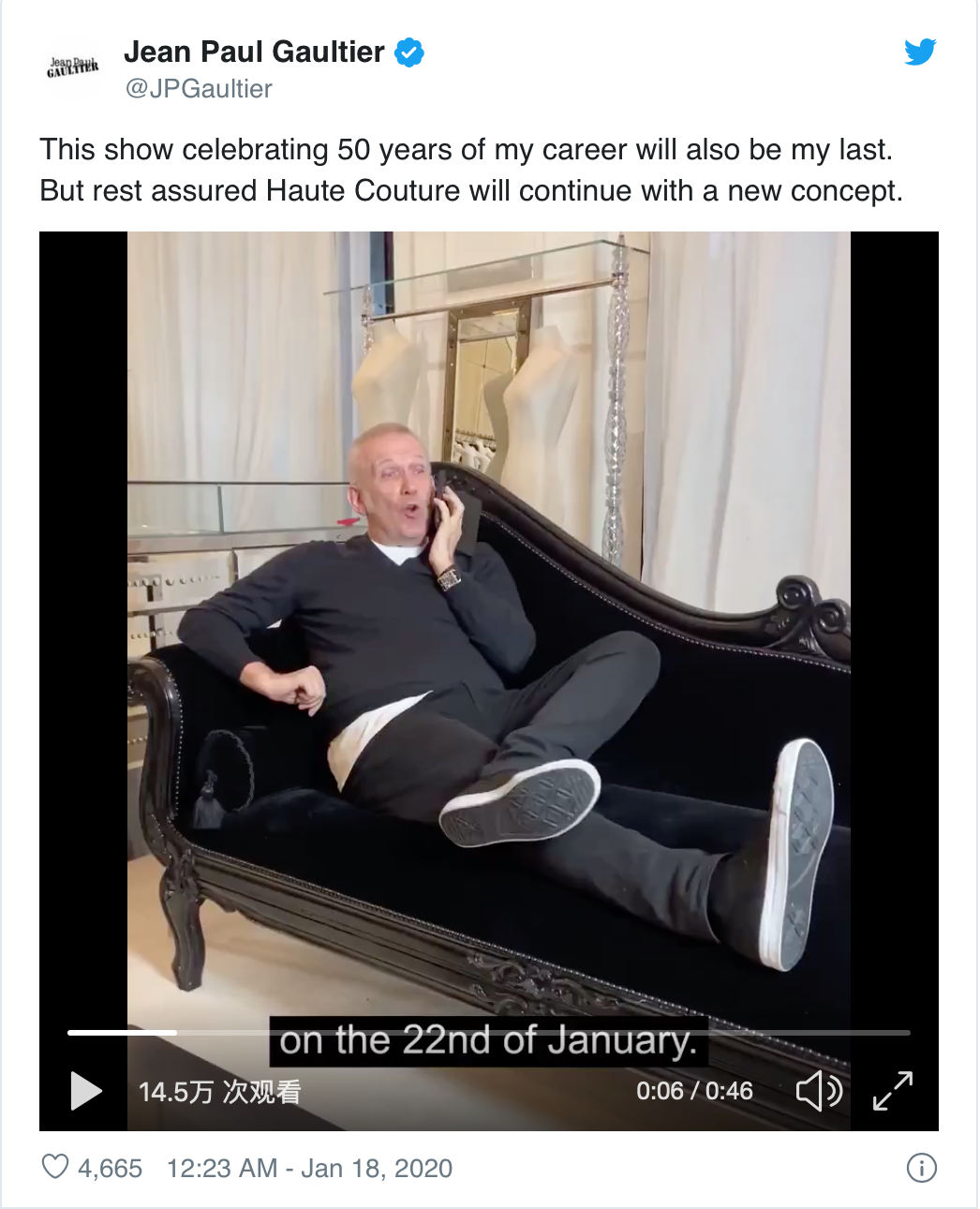 1月17日,法国设计师Jean Paul Gaultier在推特上宣布,即将在1月22日发布的秀既是庆祝自己职业生涯50周年,也会成为自己举办的最后一场秀。