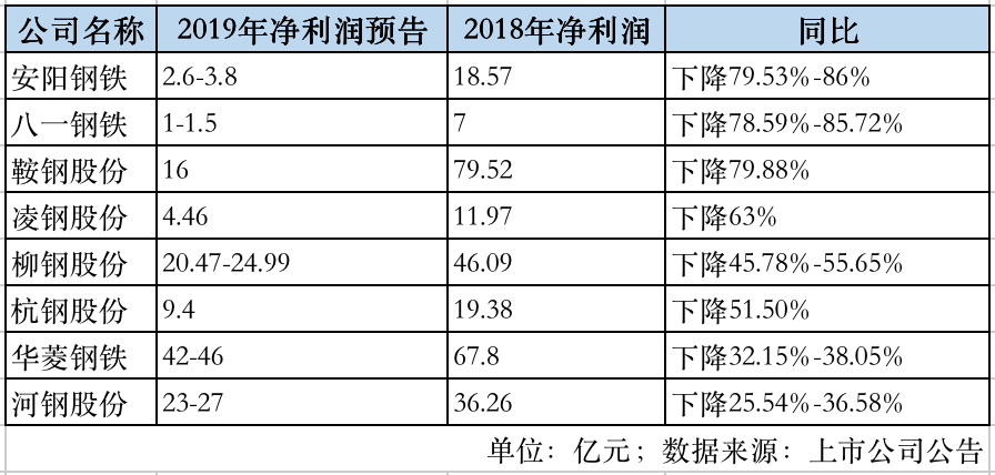 其中,安阳钢铁(600569.SH)以86%的至多跌幅居于榜首。2019年,其净利润预计2.6亿-3.8亿元,去年同期为18.57亿元。