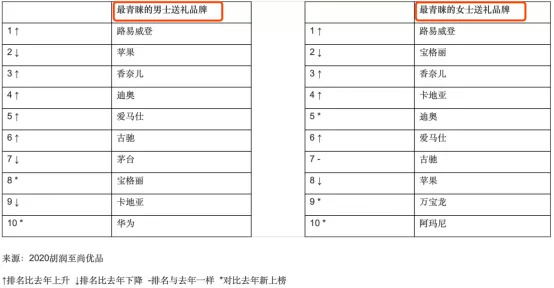 近日,胡润研究院发布《2020中国千万富豪品牌倾向报告》,在高净值人群最青睐的送礼品牌中,路易威登(以下简称LV)超越苹果和宝格丽,成为最青睐的男女送礼品牌,荣登“双冠”宝座。