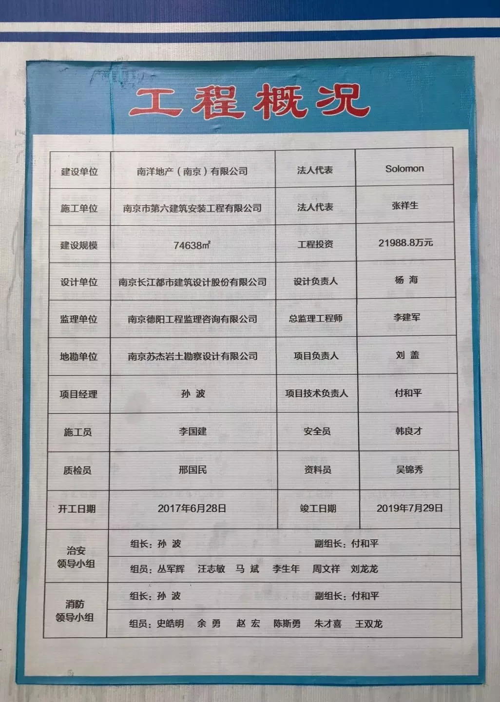 项目工程概况表写着,项目开工日期是2017年6月28日,竣工日期为2019年7月29日。