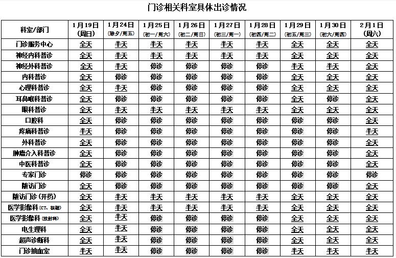 2020年1月19日(周日)、2月1日(周六)普通门诊全天开放。