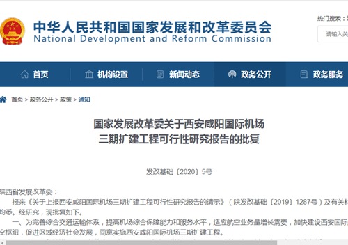 据国家发改委官网消息,2020年1月19日,国家发改委官方网站正式挂出了对西安咸阳国际机场三期扩建工程可行性研究报告的批复文件,标志着整个西北地区,民航发展有史以来最大的基础设施项目取得重大进展。