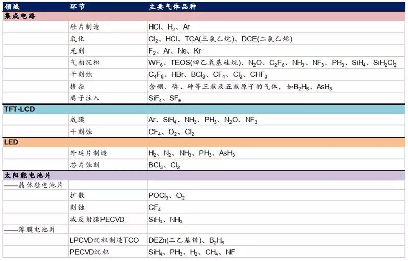 气体的产品种类丰富,电子元器件在其生产过程中对气体产品存在多样化需求。例如集成电路制造需经过硅片制造、氧化、光刻、气相沉积、蚀刻、离子注入等工艺环节,这个过程中需要的高纯特种气体和混合气体的种类超过 50 种,且每一种气体应用在特定的工艺步骤中。此外,在显示面板、LED、太阳能电池片等器件的制造中的不同工艺环节均会用到多种特种气体。