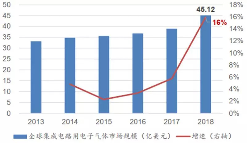 半导体用电子特气行业增速高。在半导体领域,电子特气在半导体制造的材料成本中占比高达 13%,是仅次于硅片的第二大材料。仅从集成电路用电子气体来看,据中国产业信息网的数据,2018 年全球集成电路用电子气体的市场规模达到 45.12 亿美元,同比增长 16%,中国集成电路用电子特气的市场规模约 4.89 亿美元。