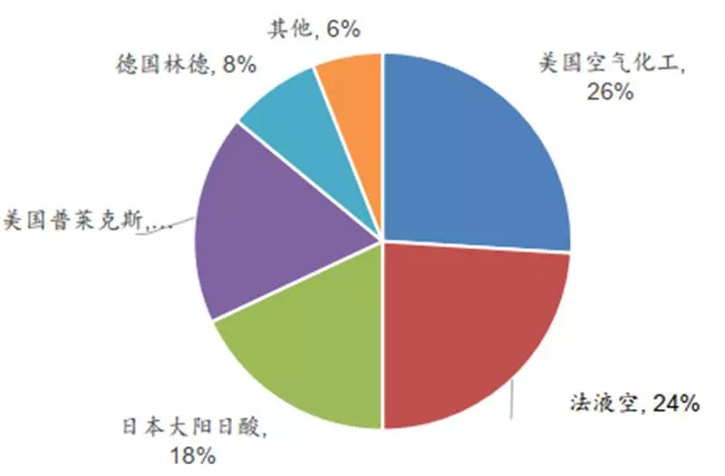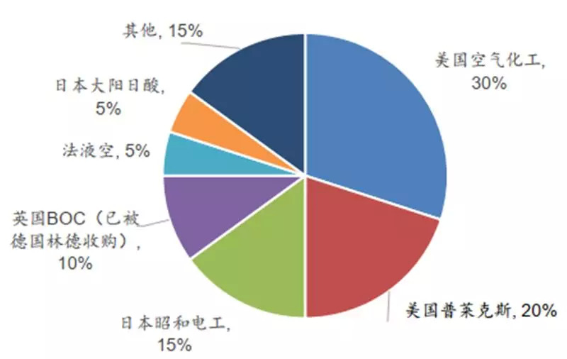 由于技术壁垒高、制备难度大,目前全球电子特气市场被几家海外龙头企业垄断。主要公司有美国空气化工产品公司、法国液化空气集团、日本大阳日酸株式会社、美国普莱克斯公司、德国林德集团(2018年与美国普莱克斯公司合并)等,合计占据全球市场 94%的份额。中国的电子特气市场中,外资巨头也牢牢控制了 85%的市场份额,进口替代需求强烈。