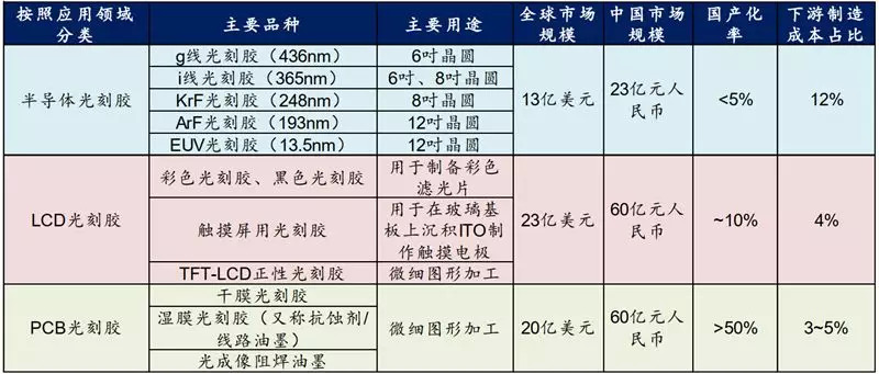LCD 面板领域需要的光刻胶品种还包括触摸屏用光刻胶、TFT 正性胶等,这些品种用量较小。