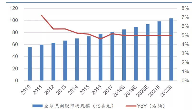 随着电子信息产业发展的突飞猛进,光刻胶市场总需求不断提升。2019 年全球光刻胶市场规模预计近90 亿美元,自 2010 年至今 CAGR 约 5.4%,预计未来 3 年仍以年均 5%的速度增长,预计至 2022 年全球光刻胶市场规模将超过 100 亿美元。
