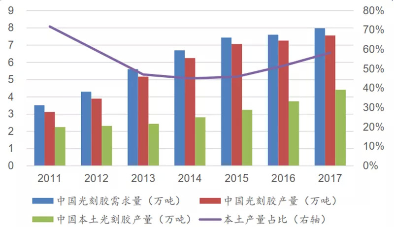 ▲中国光刻胶市场供需情况