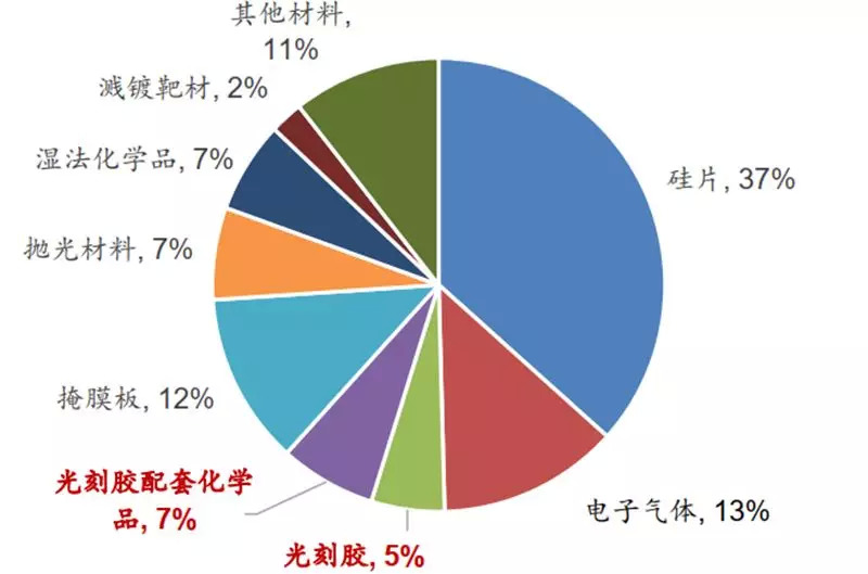 半导体是光刻胶最重要的应用领域。光刻和刻蚀技术是半导体芯片在精细线路图形加工中最重要的工艺,决定着芯片的最小特征尺寸。光刻工艺的成本约为整个芯片制造工艺的 30%,耗时约占整个芯片工艺的40%~50%,是芯片制造中最核心的工艺。光刻胶及其配套化学品在芯片制造材料成本中的占比高达 12%,是继硅片、电子气体的第三大 IC 制造材料。