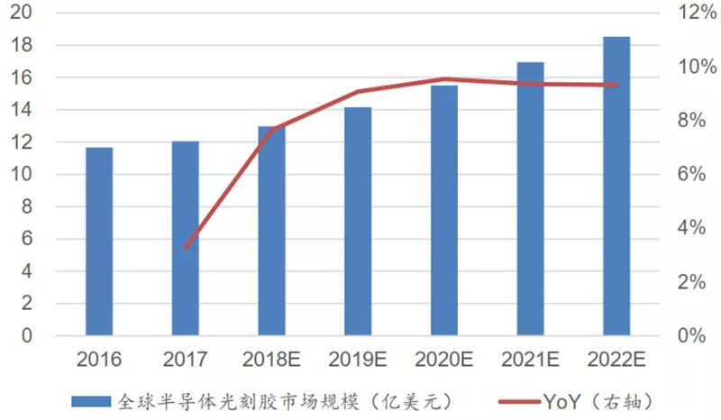 光刻胶市场需求快速增长。随着半导体线路图形越来越小,光刻工艺对光刻胶的需求量也越来越大。据测算,2018 年全球半导体用光刻胶市场规模约 13 亿美元,预计未来 5 年年均增速约 8%~10%;中国半导体用光刻胶市场规模约 23 亿元人民币,预计未来 5 年年均增速约 10%。