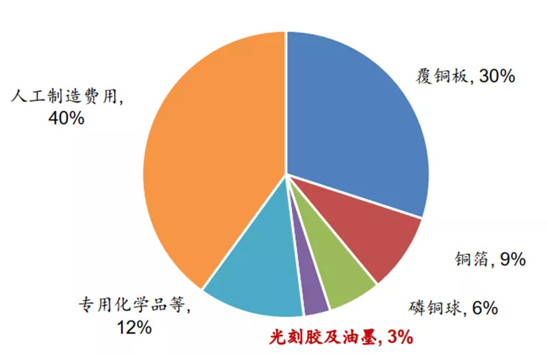 在 PCB 领域,光刻胶主要包括干膜光刻胶、湿膜光刻胶、光成像阻焊油墨,约占 PCB 制造成本的3%。