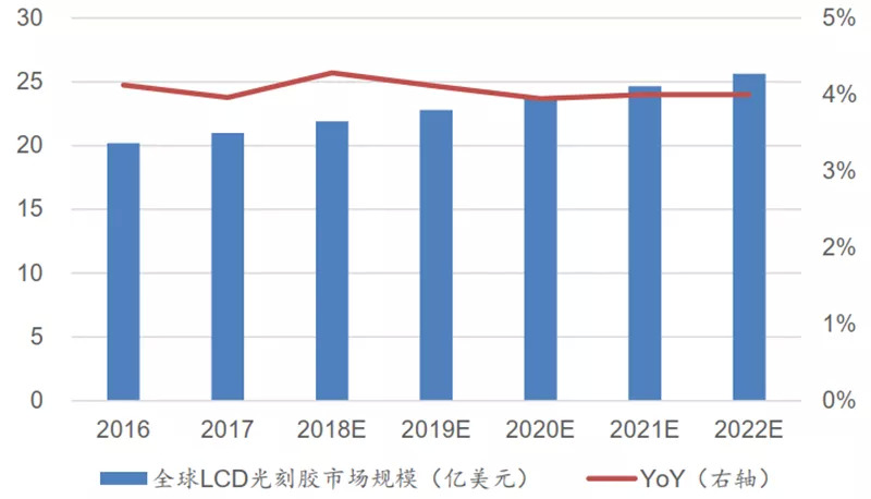 LCD 光刻胶全球市场规模约 23 亿美元,其中中国市场规模约 9 亿美元。根据智研咨询数据,2019 年全球 LCD 用光刻胶市场规模约 23 亿美元,过去 5 年平均增速在 4%左右,预计未来 3 年增速也在 4%左右。2019 年中国 LCD 面板产能占全球比重已达 40%左右,据此测算中国 LCD 光刻胶市场规模约 9亿美元。
