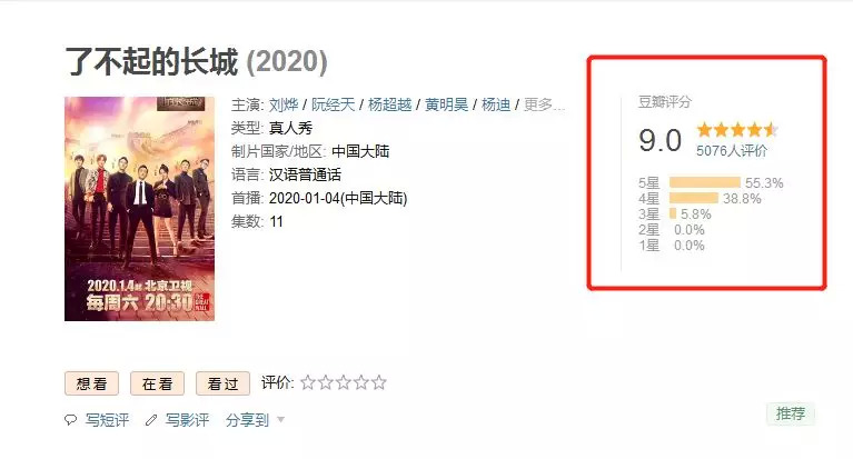 作为“全球首档长城文化体验户外真人秀”,《了不起的长城》播出首期即以9.0分在豆瓣成功开分。虽然节目的自我定位略显冗长,简而言之就是明星嘉宾团登上十段长城,并学习相关历史文化。
