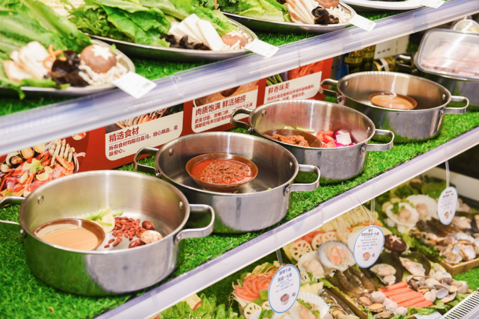 上海的猪肚鸡火锅,重庆的小龙虾火锅,北京花胶鸡火锅,陕西的海鲜番茄锅,武汉的老坛酸菜鸭嘴鱼火锅……都可以最快 30 分钟免费送货到家。在广东,盒马新推出了海鲈海鲜套餐,食材是门店新鲜的海鲈鱼整条切片、基围虾、鱼蛋。另外还有基围虾海鲜锅、元贝海鲜锅、波士顿龙虾锅供消费者选择。