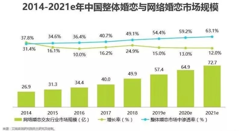 婚恋这块蛋糕虽难吃透但着实“钱景”诱人。2019年,我国互联网婚恋交友行业规模达到了57.4亿元,网络婚恋市场在整体婚恋市场中渗透率更上升至54.4%,预计到2021年,互联网婚恋市场总营收或超70亿元,渗透率将进一步提升。