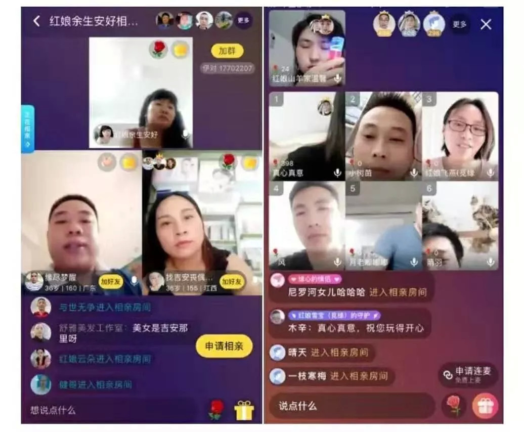 一种是一两名红娘主持人、多名男女嘉宾的多人“非诚勿扰”,其他用户也可进入相亲房间围观,期间用户可以发表评论、赠送礼物,房间人数多达数百人;