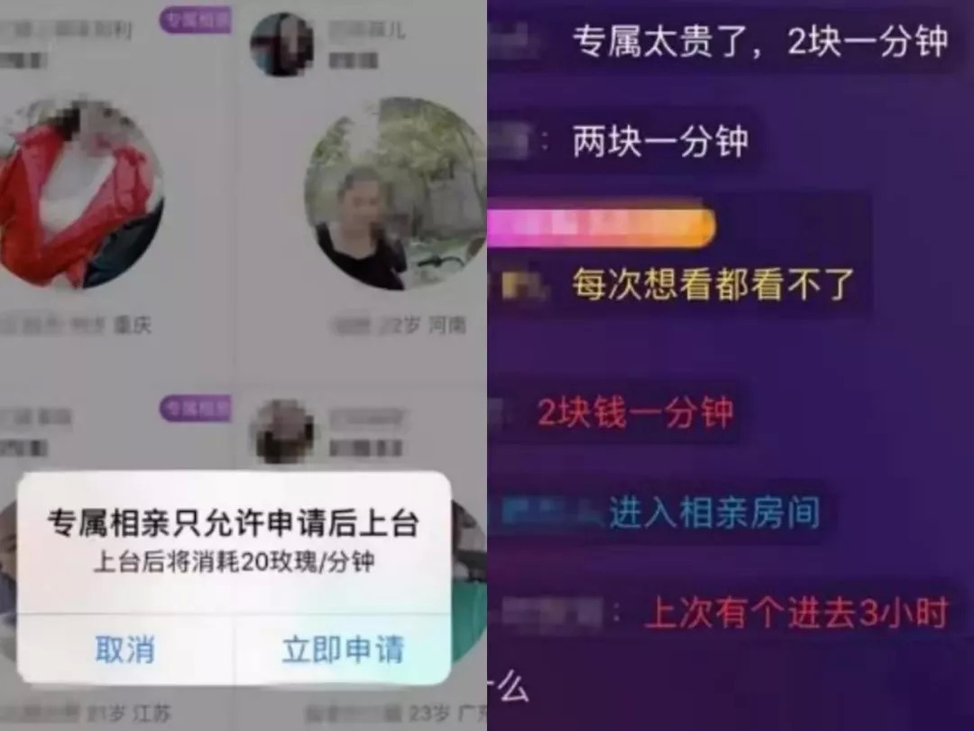 一种是红娘、男女嘉宾的3人视频相亲,其他用户不可进入相亲房间观看整个相亲过程;还有一种是私密相亲,需要申请才能进入。