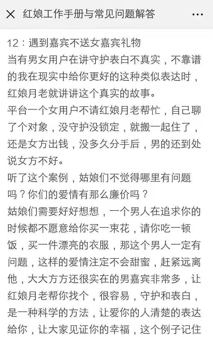 不送礼无相亲,在网上流传的一份《红娘工作手册》里,就有专门针对“遇到男嘉宾不送礼物”的话术,在将金钱和真爱划上等号之后,不掏钱成了一种原罪。