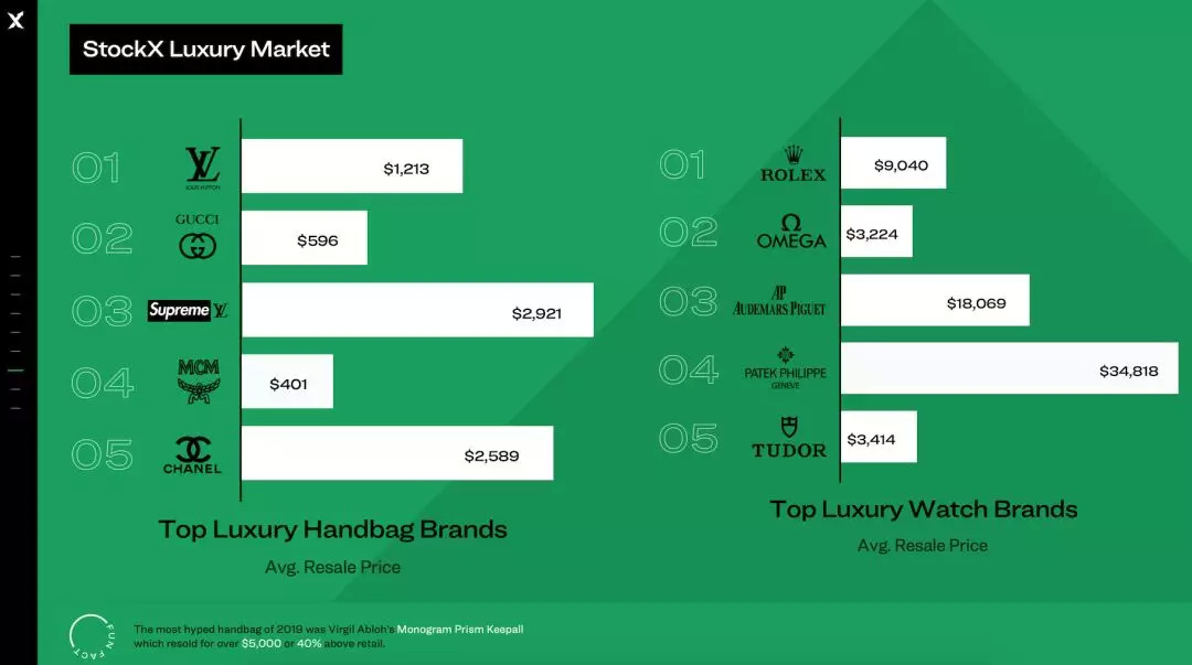 手表方面,Rolex(劳力士)市场份额最高,Patek Philippe(百达斐丽)平均转售价格最高,达3.48万美元
