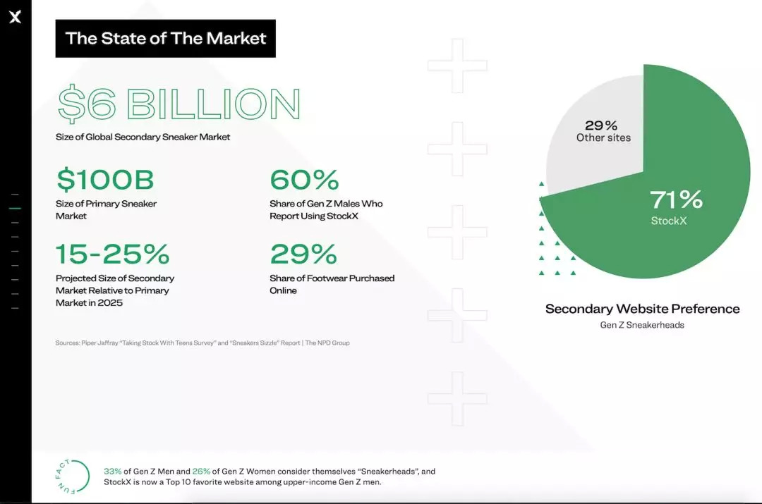 StockX 在报告中指出,全球二手运动鞋市场当前的规模为60亿美元,尽管运动鞋一级市场仍旧以1000亿美元的规模独占鳌头,但到2025年,线上转售将推动二级市场持续增长,届时二级市场规模将达到一级市场的15~25%。