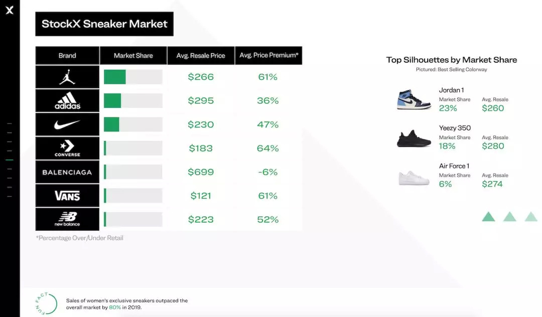 就市场份额来看,2019年,StockX 交易量最大的运动鞋品牌分别是:Jordan、adidas、Nike。其中: