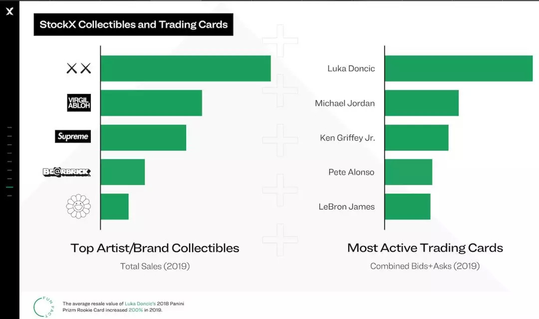 Kaws、Virgil Abloh、Supreme 是艺术家/品牌联名销售额前三。交易卡方面,综合交易和评论提问,Dallas Mavericks(达拉斯小牛队)运动员、Jordan 品牌篮球阵营成员 Luka Dončić 问鼎,同样上榜的还有 Michael Jordan、Ken Griffey Jr.、Pete Alonso 和 LeBron James。2019年,Luka Dončić 的 2018 Panini Prizm Rookie Card 的平均转售价格涨幅达200%。