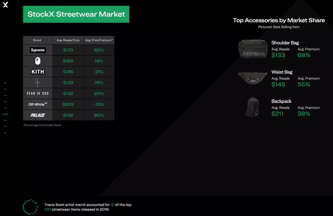 平均溢价最高的是有“英国 Supreme”之称的品牌 Palace,较零售价格溢价80%,接着是 Travis Scott 的 Cactus Jack,较零售价格溢价76%,然后是 Supreme,平均溢价增幅为69%