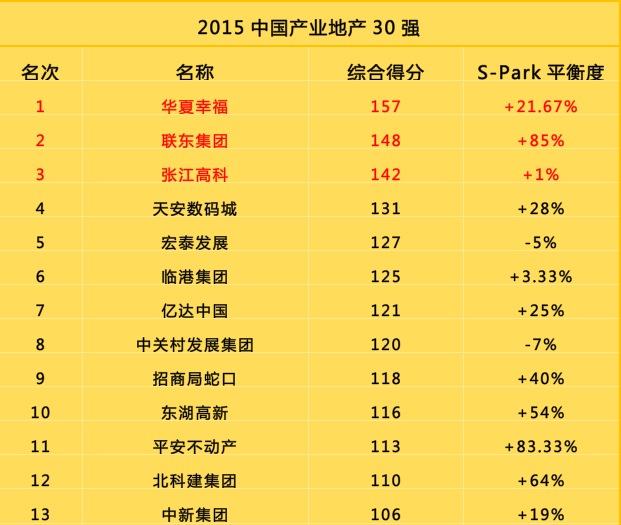 2015中国产业地产30强榜单由产业地产评估机构火花S-Park与园区中国于9月23日联合发布,华夏幸福、联东集团和张江高科成为产业地产行业的前三甲。与30强榜单一同发布的还有“2015年中国产业地产品牌估值榜”和“2015传统房企转型产业地产评分榜”。