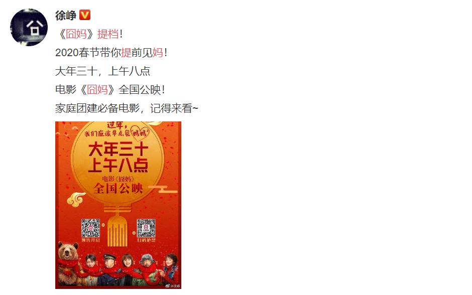1月20日,徐峥通过其微博宣布,原定1月25日(大年初一)上映《囧妈》提档至1月24日(大年三十)上午八点全国公映。