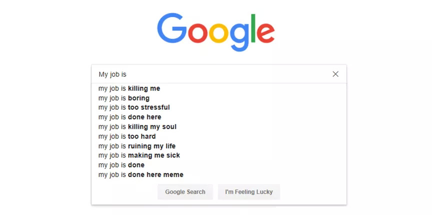 在Google输入“我的工作”,自动填充显示最高搜索量的词条有“我的工作很无聊”、“我的工作正在杀死我的灵魂”、“我的工作正在摧毁我的生活”……