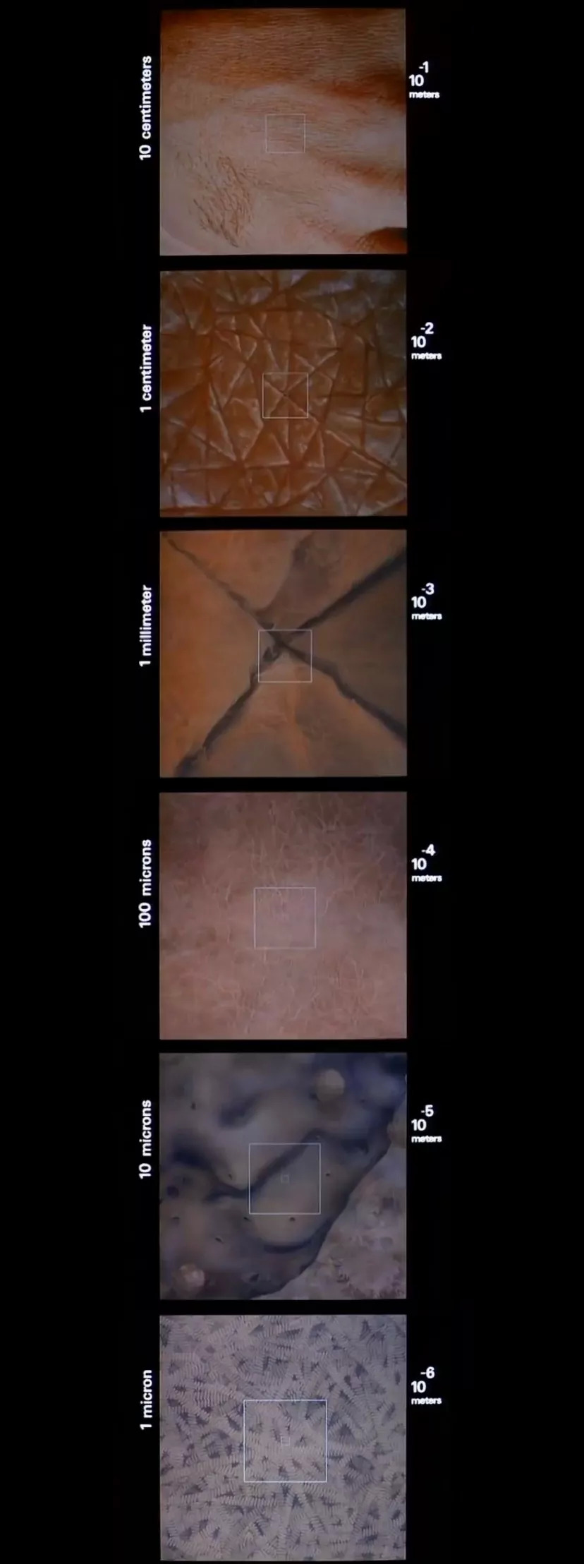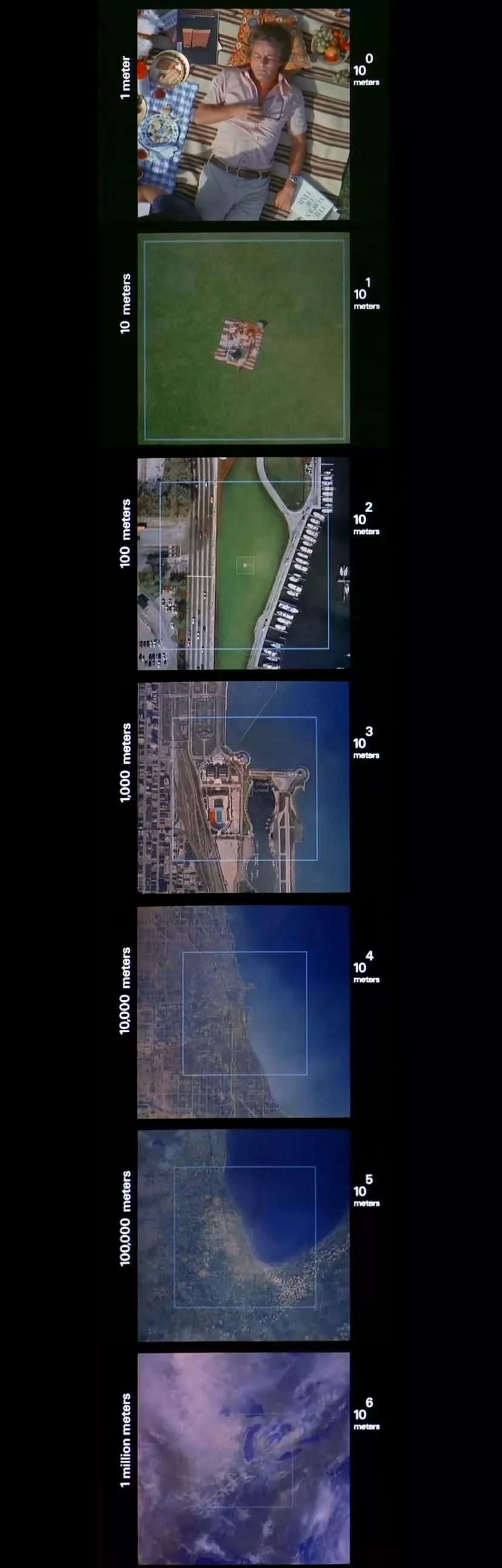 查尔斯·埃姆斯(Charles Eames)和雷·埃姆斯(Ray Eames)兄弟执导过一部叫做《十的次方》(Powers of Ten)的纪录片,这部纪录片以一对年轻夫妇在芝加哥的野餐开始,用餐完毕后,他们在草地上躺下来开始休息。这个时候,画面显示的是一个一米高的人躺在野餐毯子上的头顶镜头,然后通过每10秒增加10的幂次来拉远镜头。