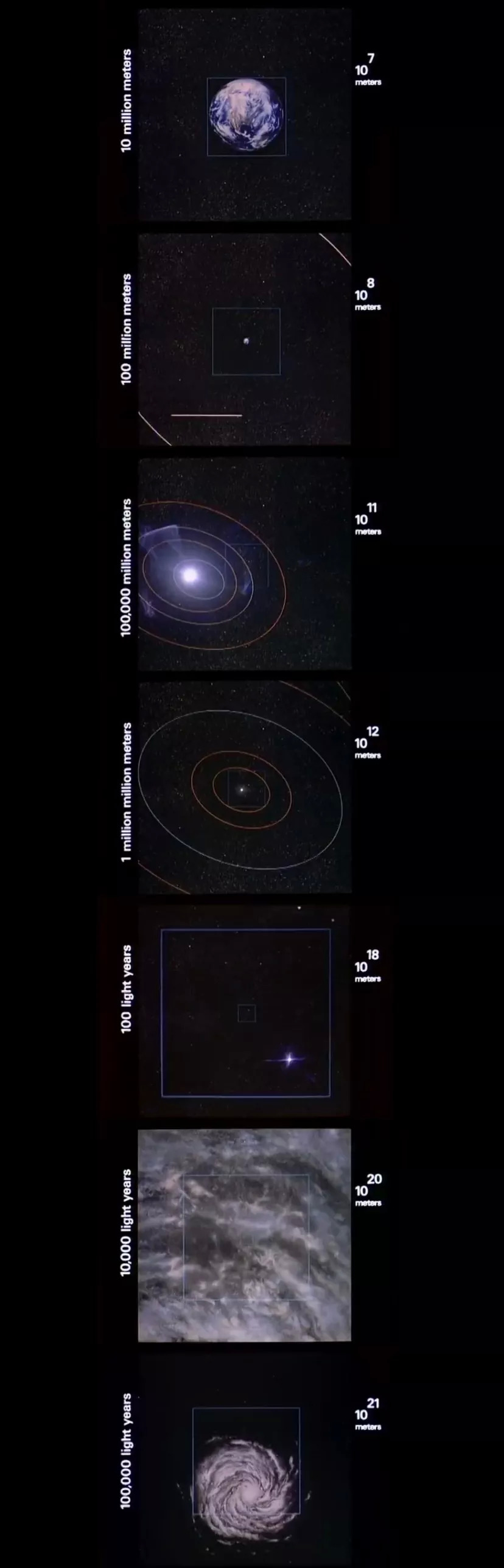 100米时,能看到三角形的草地周围是繁忙的马路和停车场;1000米,整个城市的轮廓展现出来;10万米高空,蔚蓝的海岸让人赏心悦目;百万米高空,北美大陆尽收眼底……不久到了10的7次方的距离,观众就可以看到地球,视角内月亮从身边擦肩而过,然后是太阳系,然后是银河系……