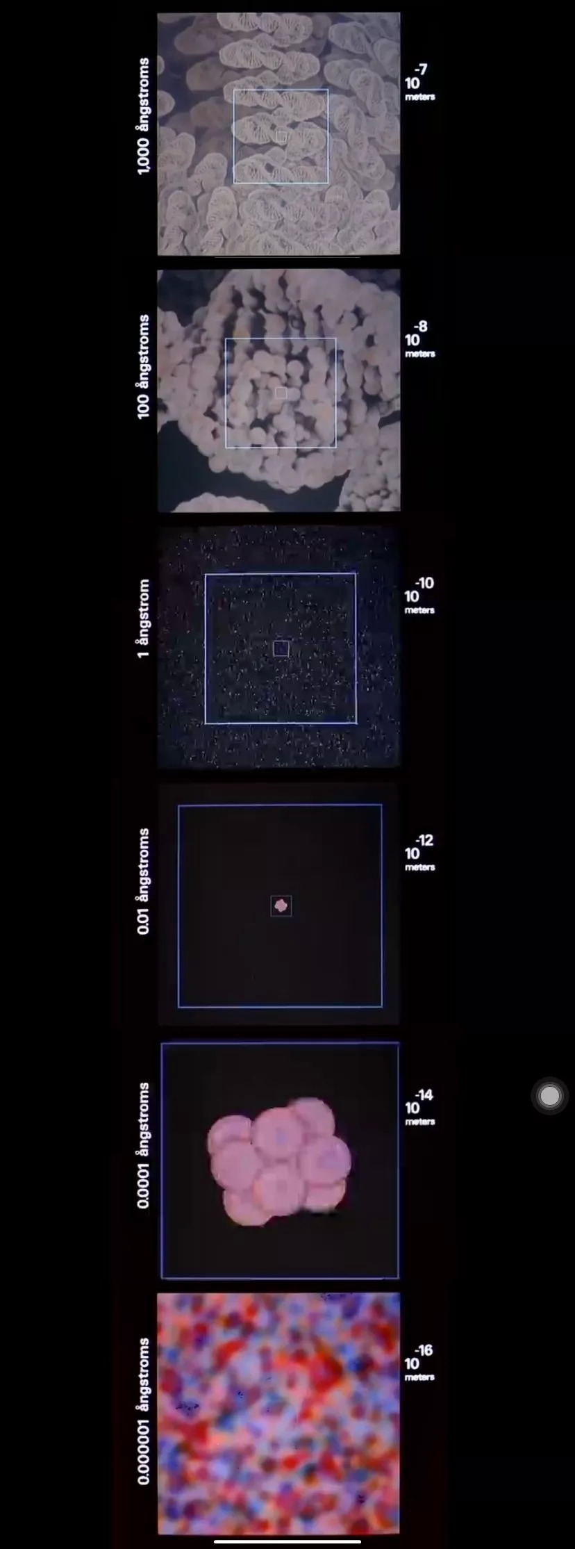 遥远的旅程结束,又回到熟睡的夫妻身边,镜头开始以负幂次方的距离推近:从皮肤表层结构到肌肉纤维,从蛋白质颗粒到DNA螺旋……