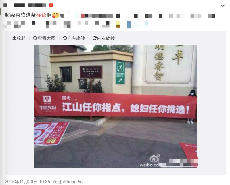2020年国家公务员考试笔试已告一段落,公考培训机构开始打响面试招生战。近日,华图教育湖北省黄冈市英山分校在街头挂出的宣传标语引起广泛争议。该标语称“考上公务(员),江山任你指点,媳妇任你挑选”。