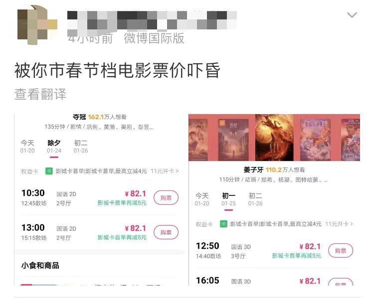 “今年春节档电影票价没事吧,我老家一个十八线不能再偏远的小县城均价50+,还以为看错了刷新了好几遍。”