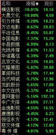 第二个变故是影视股大跌。1月初还蒸蒸日上的影视股,陡然间冰天雪地。截止今日收盘,横店影视、万达电影跌停,中国电影跌幅超过7%,唐德影视跌超5%,光线传媒、当代明诚、金逸影视等个股纷纷走低。