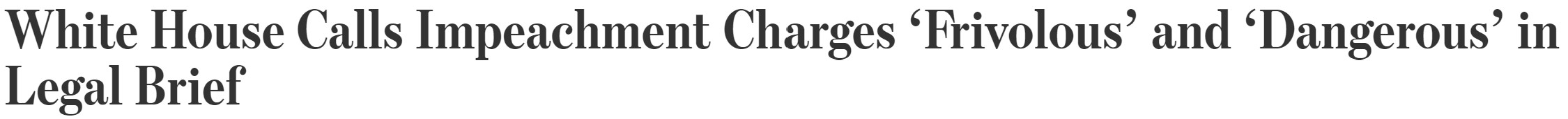 特朗普的团队周一向参议院提交了一份110页的法律简报,其中首次详细阐述了总统对两项弹劾条款的法律辩护。据特朗普法律团队的工作人员透露,白宫的简报辩称弹劾条款不包括总统违法的内容,虽然这不是弹劾的必要条件,但却是历届总统弹劾案的标准。