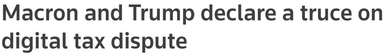 【马克龙和特朗普宣布在数字税争端方面休战】法国总统马克龙周二表示,他与美国总统特朗普在巴黎计划征收数字税方面进行了“很好的讨论”,并表示两国将共同努力避免关税上调。