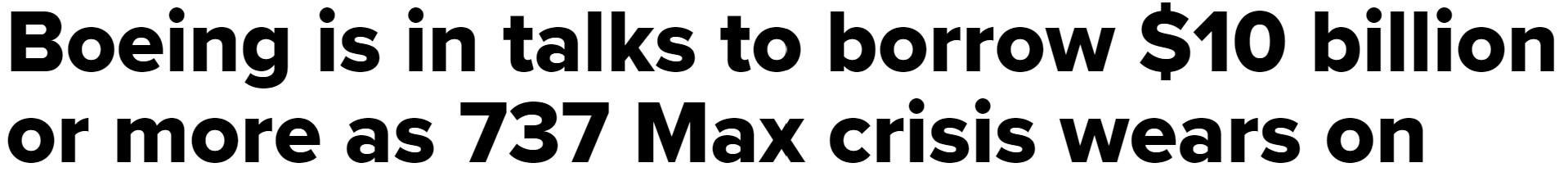 【波音在磋商获得100亿美元或更多银行贷款】据知情人士透露,波音正与银行进行磋商以获得100亿美元或更多的贷款。两起致命的737 Max坠机事故导致该公司的成本在上升。