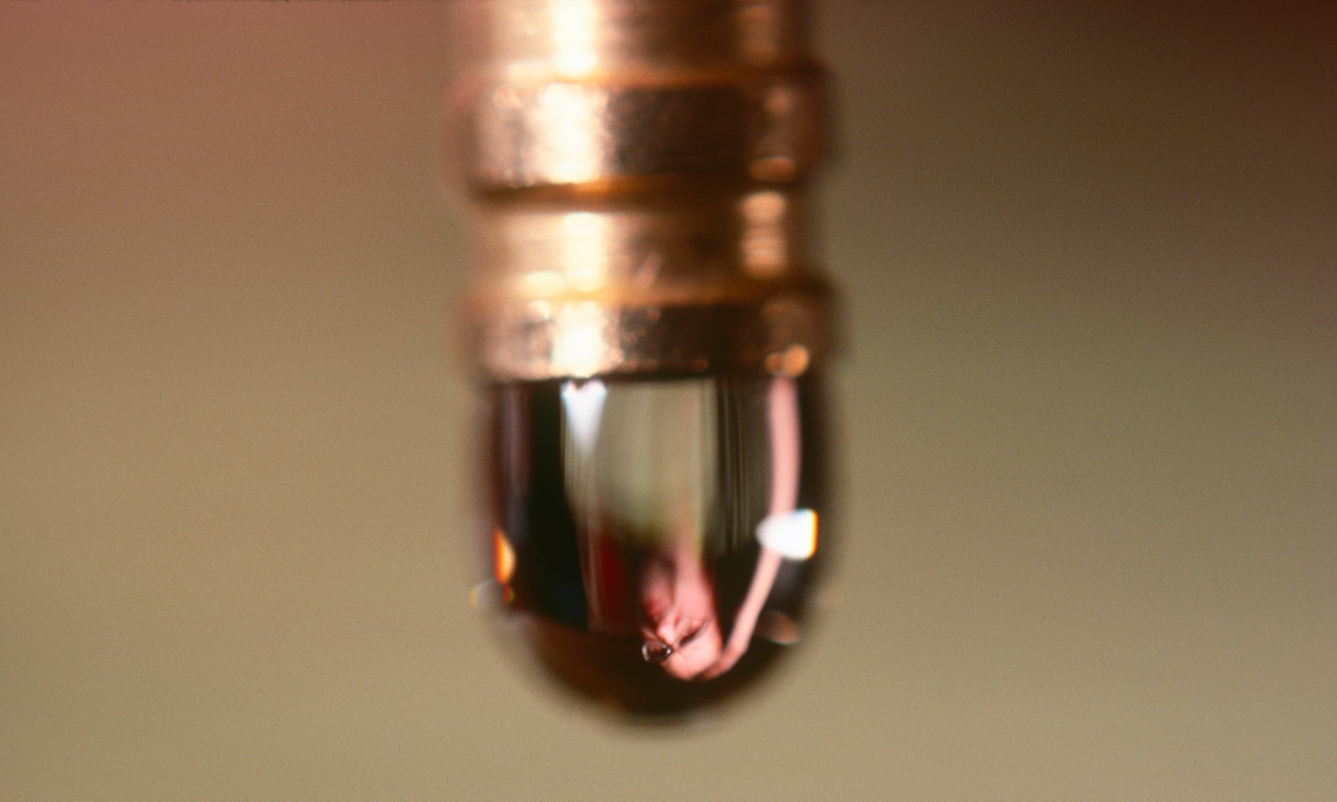 一部彩色摄像机对准了这持续膨胀中的水滴,它装有拍摄极近特写的特制镜头,其拍摄的画面投射在展览空间后部的大屏幕上。水滴的光学特性使它如鱼眼镜头一般,折射出屋子和屋中人的图像。水滴不断膨胀,直到充满屏幕,然后突然颤抖,并掉出画面。水滴落在一只小扩音鼓上,发出响亮的“咚”声。随后,新的水滴形成、再次充满屏幕,用和刚才如出一辙的方式吸引着观者的注意。