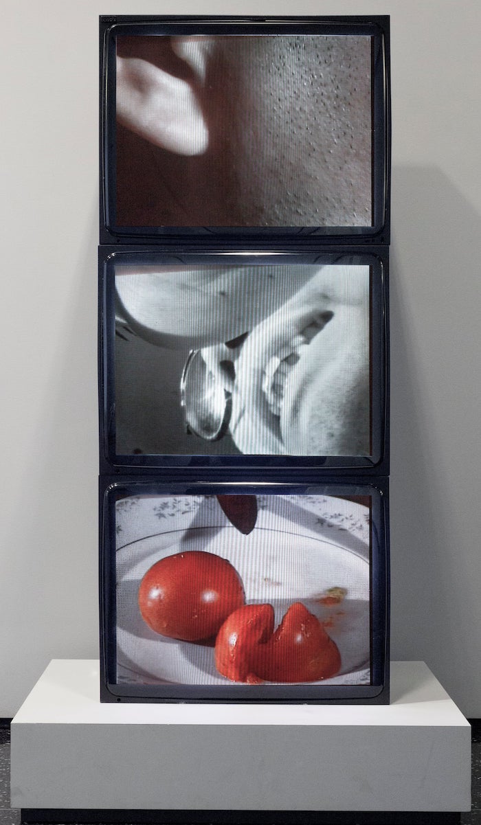 在我即将结束那次访问之时,张培力向我展示了《进食》,这是一件影像雕塑,它由三个画面同步、摞成一摞的显示屏组成。各个显示屏从不同视角展示了同一场景:最上方的屏幕显示着一副正在咀嚼的面颊;中间的屏幕是黑白的,其画面如同监控录像一般:一只叉子往返于盘子和口腔之间,这段影像由绑在用餐者手臂上的相机录制;下方的屏幕上,一些西式食物(煮蛋、番茄、千层蛋糕)不断从瓷盘上消失。