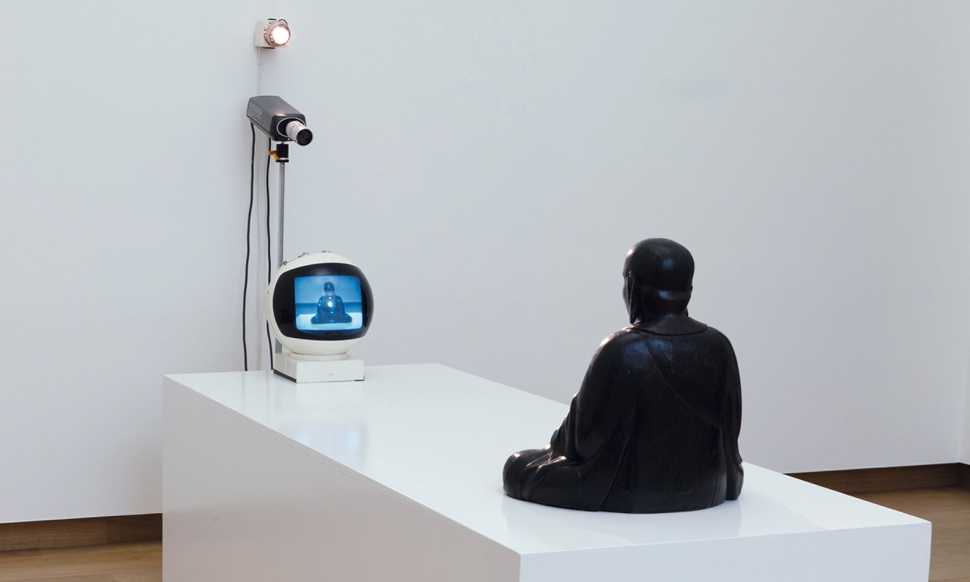 1965年,白南准入手了市面上最早的摄像机之一,并来到曼哈顿——他的新故乡。1974年,他创作了《电视佛陀》(TV Buddha):一尊面无表情的石佛呈打坐状,一部摄像机对准佛像。佛像凝视着面前的电视,而电视屏幕上正是这尊佛像的图像。一切都一动不动,这不仅让观者心生疑惑:屏幕上的图像究竟是直播还是预先录制好的内容?这有什么区别呢?
