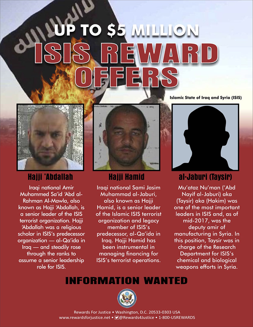 此前,美国国务院曾通过“正义奖励计划”(Rewards for Justice)网站悬赏500万美元,捉拿萨勒比(当时称“哈吉·阿卜杜勒”)及其他两位ISIS头目。